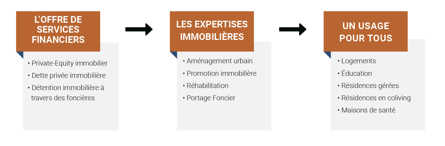 Notre engagement envers un habitat accessible à tous se concrétise à travers notre vaste gamme de services financiers. Grâce à nos expertises immobilières en aménagement urbain, promotion immobilière, réhabilitation et portage foncier, nous sommes en mesure de financer une multitude de projets, du logement à l'éducation, en passant par des résidences gérées, le coliving, les maisons de santé, et bien d'autres initiatives novatrices. Nos offres en Private-Equity immobilier, Dette privée immobilière, et Détention immobilière via des foncières, constituent le socle financier solide qui soutient notre mission, offrant ainsi des solutions viables pour répondre aux besoins diversifiés en matière d'habitat et de services.