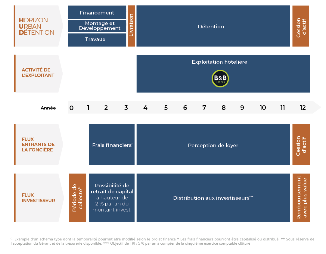 Horizon Urban Detention est une foncière : elle a vocation à acquérir des actifs immobiliers destinés à être loués ou exploités durant un certain nombre d’année (ou à investir dans des sociétés ayant cette stratégie). Son portefeuille se composera principalement de murs d’hôtels.